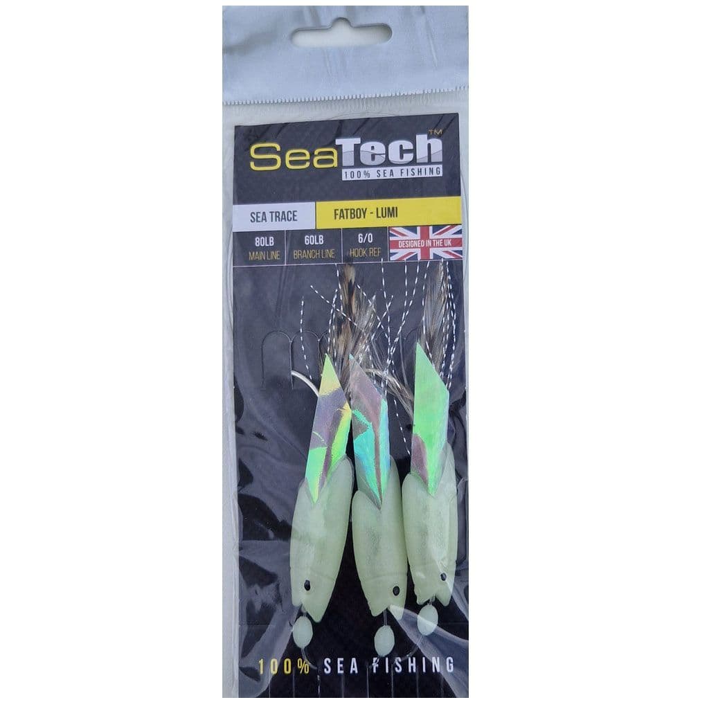 SeaTech Sea Trace | Fatboy Rig 3 Hook Lumi - SeaTech Sea Trace | Fatboy Rig 3 Hook Lumi, a beefed up version of the Hockeye trace this Fatboy 3 hook rig features a pearlescent flash, white tail and glow in the dark luminous soft rubber body. This size is perfect for cod, coalfish, pollock, bass etc