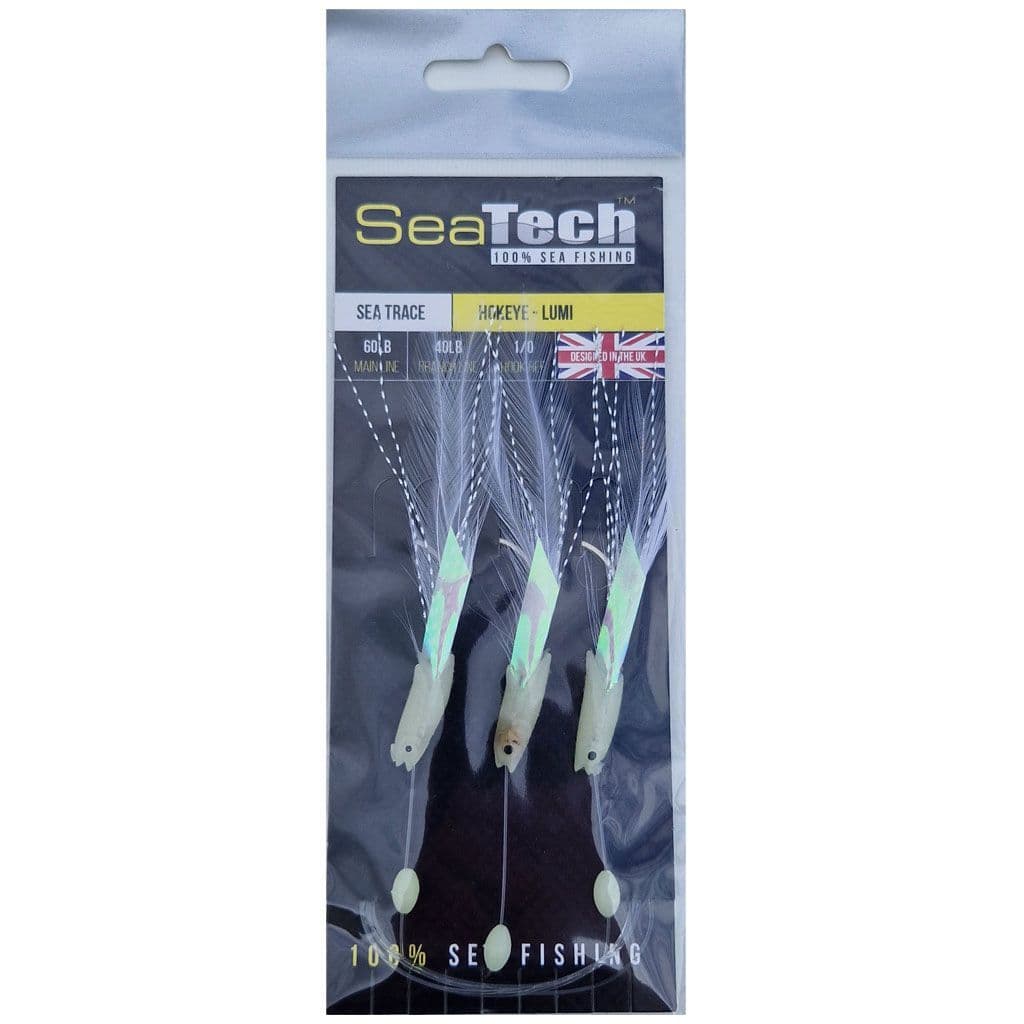 SeaTech Sea Trace | Hockeye Rig 3 Hook Lumi - SeaTech Sea Trace | Hockeye Rig 3 Hook Lumi, a popular 3 hook rig featuring a pearlescent flash, white tail and glow in the dark luminous soft rubber body. This size is perfect for mackerel, pollock, bass etc